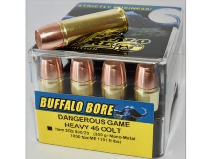 Buffalo Bore Dangerous Game ammunition is a line of mono-metal,  non-expanding, dangerous game loads. These “Dangerous Game” (DG) loads are