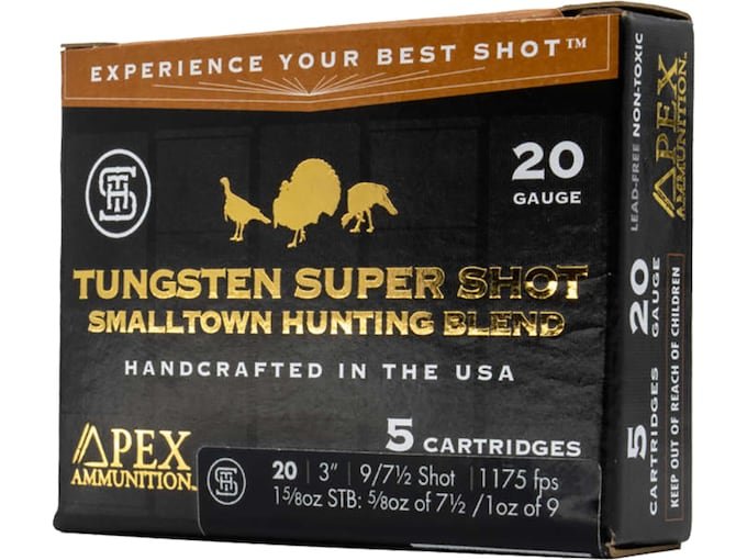 Be the first to review “Apex Turkey TSS Smalltown Hunting Blend Ammunition 20 Gauge 3″ 1-5/8 oz #7-1/2 & #9 Non-Toxic Tungsten Super Shot Box of 5” Cancel reply