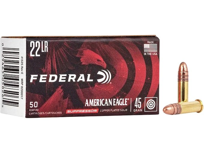 Federal American Eagle Suppressor Ammunition 22 Long Rifle 45 Grain Copper Plated Lead Round Nose