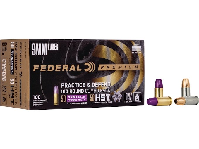 Practice & Defend HST/Syntech Combo Ammunition Packs pair the self-defense load proven by law enforcement with the industry’s most complete training ammunition for a combination like no other. Federal Practice & Defend Packs include 50 HST Personal Defense loads and 50 Syntech Training Match rounds. All produce identical velocities, trajectories and point of impact for the most realistic training and utmost protection. Practice loads feature reloadable brass casing and Defense loads are in reloadable, Nickel plated brass. FeaturesBallistically paired Syntech Training Match and HST loadsPractice loads’ Total Synthetic Jacket prevents metal fouling, reduces barrel heat and friction, and minimizes splash-back against hard targetsHST expands reliably through a variety of barriers and penetrates to ideal depths for self-defense situationsFlawless function and reliability in semi-automatic pistols