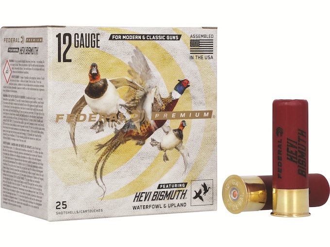 Never compromise performance. Federal Premium HEVI-Bismuth hits both upland birds and waterfowl with the power of 9.6 g/cc density pellets. Sourced from HEVI-Shot, the industry leader in pellet technology, HEVI-Bismuth shot is 22 percent denser than steel, delivering more lethal energy downrange. Launched by the FLITECONTROL FLEX wad, bismuth pellets pattern consistently, and their metallic properties make them safe in both modern and classic shotguns. FeaturesAt 9.6 g/cc, HEVI-Bismuth pellets are 22 percent denser than steelMore downrange energyHigher pellet counts than comparably performing steelSofter than steel and tungstenRear-deploying FLITECONTROL FLEX wad creates more consistent, efficient patterns in ported and non-ported chokesSafe and effective for use in both classic and modern shotgunsPellets are alloyed and cast in the USA