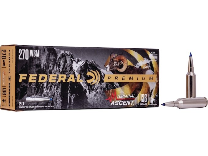 Federal Premium Terminal Ascent Ammunition 270 Winchester Short Magnum (WSM) 136 Grain Polymer Tip Bonded Boat Tail Box of 20