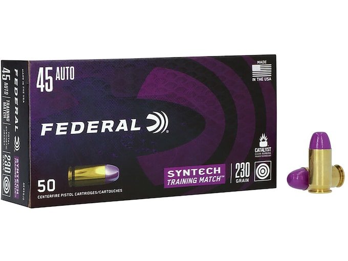 If practice isn’t realistic, it’s not really practice. Make range time matter with Federal Syntech Training Match, loads that offer the same velocity, trajectory and point of impact as equivalent Federal Premium Personal Defense HST and Tactical HST duty ammunition. Like all Syntech offerings, Syntech Training Match features the one-of-a-kind TSJ projectile, which uses a polymer jacket to eliminate metal fouling and drastically reduce damaging barrel heat and friction. Its Federal-exclusive Catalyst primer provides hot, reliable ignition without lead or other heavy metals, making Syntech Training Match perfect for indoor ranges. This ammunition is new production, non-corrosive, in boxer primed, reloadable brass cases. FeaturesIdentical point of impact, velocity and trajectory as equivalent HST loadsExtremely realistic and effective practicePurple jacket visually identifies matched training roundCatalyst high-performance lead-free primerTotal Synthetic Jacket prevents metal foulingDrastically reduces barrel heat and frictionMinimizes splash-back on hard targets