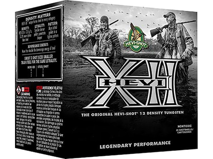 Hevi-Shot Hevi-XII Ammunition is the original Hevi-Shot, now in a 25-round box. Introducing Hevi-XII. Shoot three shot sizes smaller than steel for the same lethality with 28% more tungsten pellets on target. The end result? More kills, fewer cripples, better stories. Pack Hevi-XII in and walk out carrying extra weight. FeaturesHEVI-XII is 12.0g/cc. 53.8% more dense than steelSmaller and more dense pellets penetrate deeperMore lethal pellets in a tighter pattern