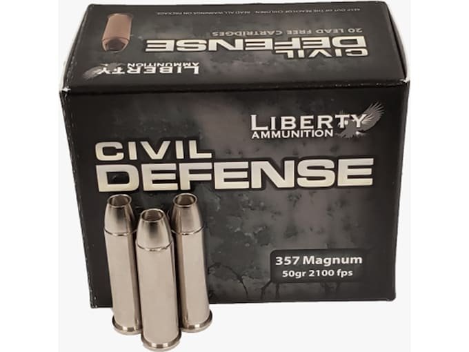 Liberty Ammunition is a Florida-based manufacturer of lead-free ammunition for the military, law enforcement, and civilian markets. The Civil Defense Lead Free .357 Magnum ammo features very deep hollow-points. When striking flesh, these bullets rapidly expand creating a large wound channel. The petals of the hollow-point tend to shear off and form their own wound tracks, causing further exsanguination. The central part of the bullet continues to penetrate deeper into the body – typically to a distance of 12” – 14” in ballistic gelatin. A penetration depth of 12” in ballistic gelatin is the arbitrary minimum distance the FBI determined was suitable for the needs of its agents. It offers a lot of the things that people want such as reliability, penetration and massive wounding. Liberty Ammunition’s Civil Defense line features a nickel-plated, CNC machined solid copper projectiles and nickel-plated brass cases, making them perfect for training, target shooting, defense or hunting especially in areas that are embracing non-lead ammunition because of the environmental dangers of lead. The nickel plating reduces barrel fouling and nickel plated cases feed better in the firearm. Nickel plating has also been credited with increasing the life cycle of the weapon system Liberty Ammunition’s deep cavity, hollow-point projectile is designed to fragment in soft tissue, resulting in a much greater transfer of kinetic energy to the target while providing three times the terminal effects of traditional, lead-based ammo in comparable calibers. Due to the proprietary design of the projectile and its solid copper construction, Civil Defense ammunition also provides exceptional performance on hard targets such as drywall, car doors, auto glass and leather/denim without sacrificing any performance in soft tissue. Despite the light weight projectile, it will penetrate soft targets deeper than expected. Liberty Ammunition’s Civil Defense ammunition is an excellent choice for use as self- defense ammunition, and it provides more than enough power to do the job. Liberty Ammunition’s Civil Defense ammunition is a high quality accurate load designed for self-defense. This copper monolithic fragmenting hollow point is designed for excellent penetration and excellent expansion. This light bullet will travel very quickly and will feel softer shooting. Liberty Ammunition’s Civil defense line provides ammunition that is useful for personal defense and home defense. The entire Civil Defense line delivers lightweight, lead-free ammunition with maximum stopping power, reduced recoil, match grade accuracy, and barrier penetration resulting in high performance green ammunition. Liberty Ammunition continues to create the world’s fastest ammunition with twice the velocity. This ammunition is new production, non-corrosive, and requires no weapons modifications.