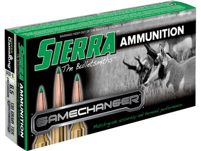The 6.5 Creedmoor is a shortened and improved 30 TC cartridge case that was inspired by the .308 Winchester design. This short-action design was created to maximize case capacity and a wide range of loading lengths, while still fitting in standard short-action magazines. The light recoil and adaptability of the efficient 6.5 Creedmoor cartridge has already proven itself in high power, precision rifle series and benchrest competitions. Couple that with the 130-grain Sierra GameChanger bullet with its .510 BC and you get a flat shooting, accurate cartridge with excellent terminal performance suitable for deer, antelope and other similar-sized game. The Sierra GameChanger hunting bullet is the perfect combination of Sierra’s legendary match accuracy coupled with deadly penetration. Sierra re-engineered their legendary MatchKing bullet into a hollow point design for quick expansion and fitted it with a transparent green tip for ballistic uniformity. Inside, the GameChanger features a unique construction that utilizes a special lead alloy surrounded by a tough copper jacket that delivers excellent penetration and expansion at a variety of ranges. It’s a GameChanger on any hunt! This ammunition is new production, non-corrosive, in boxer primed, reloadable brass cases.FeaturesOptimal jacket wall thickness controls expansion and retains weightOpen pocket under the polymer tip expands lead core instantly on impactTuned ogive for industry-leading BCBoat tail design for stable flight and accuracy
