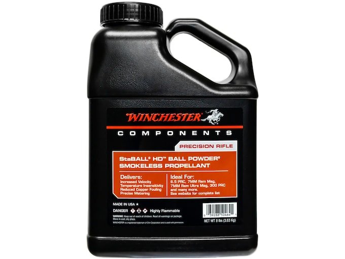 Winchester StaBall HD is at temperature-insensitive Ball Powder, stable in extreme-hot or -cold conditions. This slow-burning magnum powder provides optimal loading density in large capacity magnum cartridges appropriate for the burn speed, which is ideal for 6.5 PRC, 7mm Remington Mag, 300 PRC and many more. Typical of a ball powder, precise metering contributes to improved velocity and pressure standard deviations, ingredients that are paramount to match grade accuracy! This “environmentally green” propellant has copper fouling reducer additives, meaning longer durations of competition and field shooting without having to clean the bore. Precision accuracy throughout the match! Velocity levels obtainable, depending on the cartridge, are 75-100 fps greater than other propellants in its class. Thus, the StaBALL family provides Stability, Precision and Speed. Other Important Information: Do not exceed the loads displayed in the reloaders guide. Never mix any two powders regardless of type, brand, or source. Never substitute any smokeless powder for Black Powder or any Black Powder substitute.
