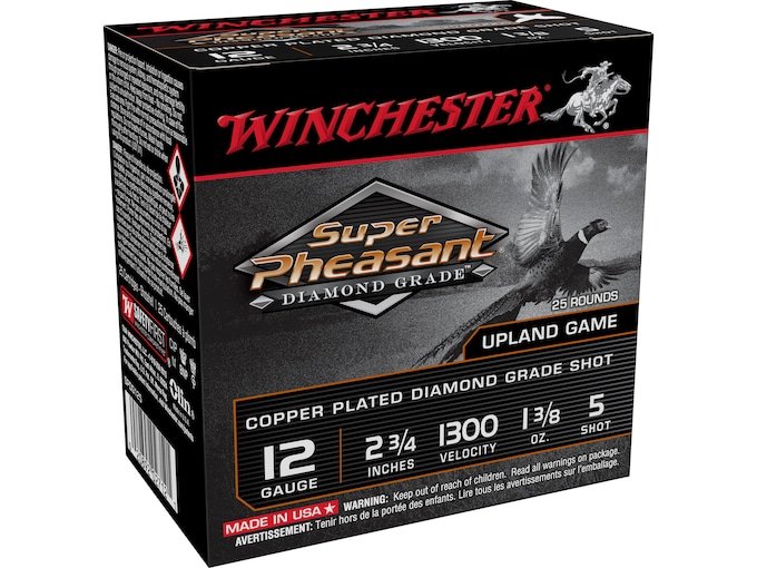 Winchester Super Pheasant Diamond Grade Ammunition is built for performance with long-range power, hard hitting plated lead shot and a tight-patterning wad that builds on the hunter’s trust in Winchester and its legendary excellence. Super Pheasant is the ideal shotshell for hunters seeking an edge in the field. Loaded with super high antimony lead shot that is precision sorted and copper plated. The pattern density and performance with this product is unmatched. FeaturesShot is precision sorted and copper plated for maximum consistencyLegendary AA Wads reduce felt-recoilHardest shot available ensures tighter patterns and reliable performance